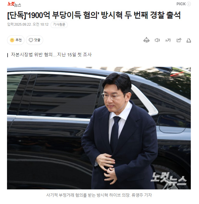 “涉嫌非法獲利1900億韓元”方時赫第二次前往警局接受調查