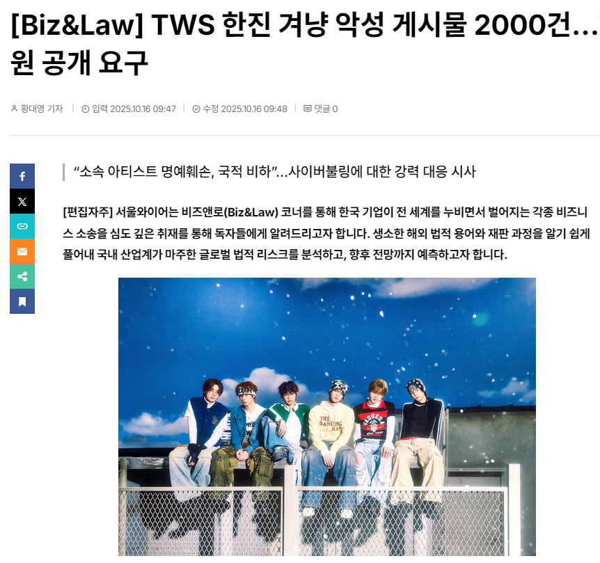 2000多篇針對TWS韓振的惡帖 HYBE要求X和谷歌公開相關惡評者身份