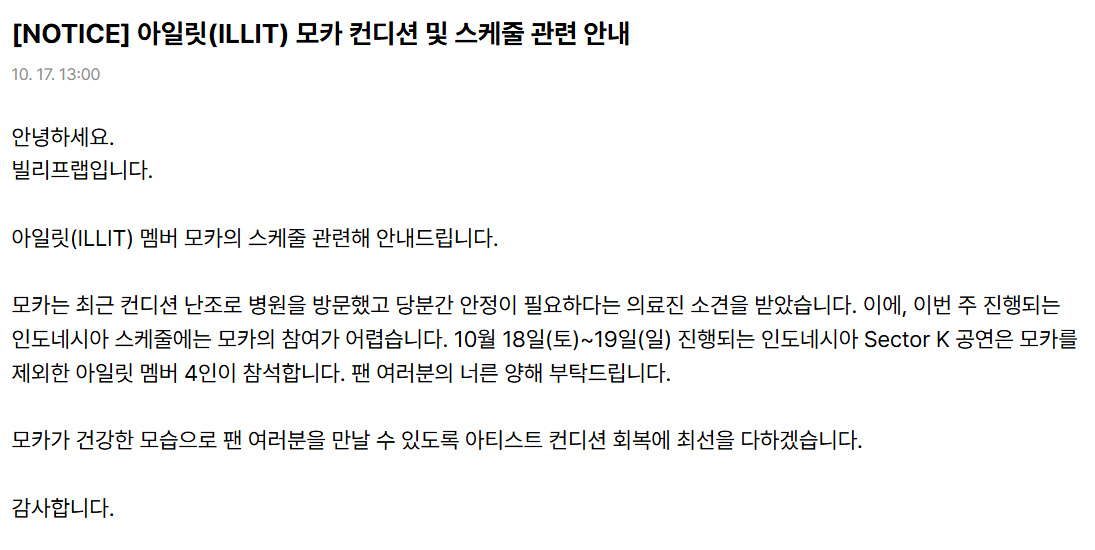 ILLIT成員MOKA因身體健康暫停活動 將專心治療